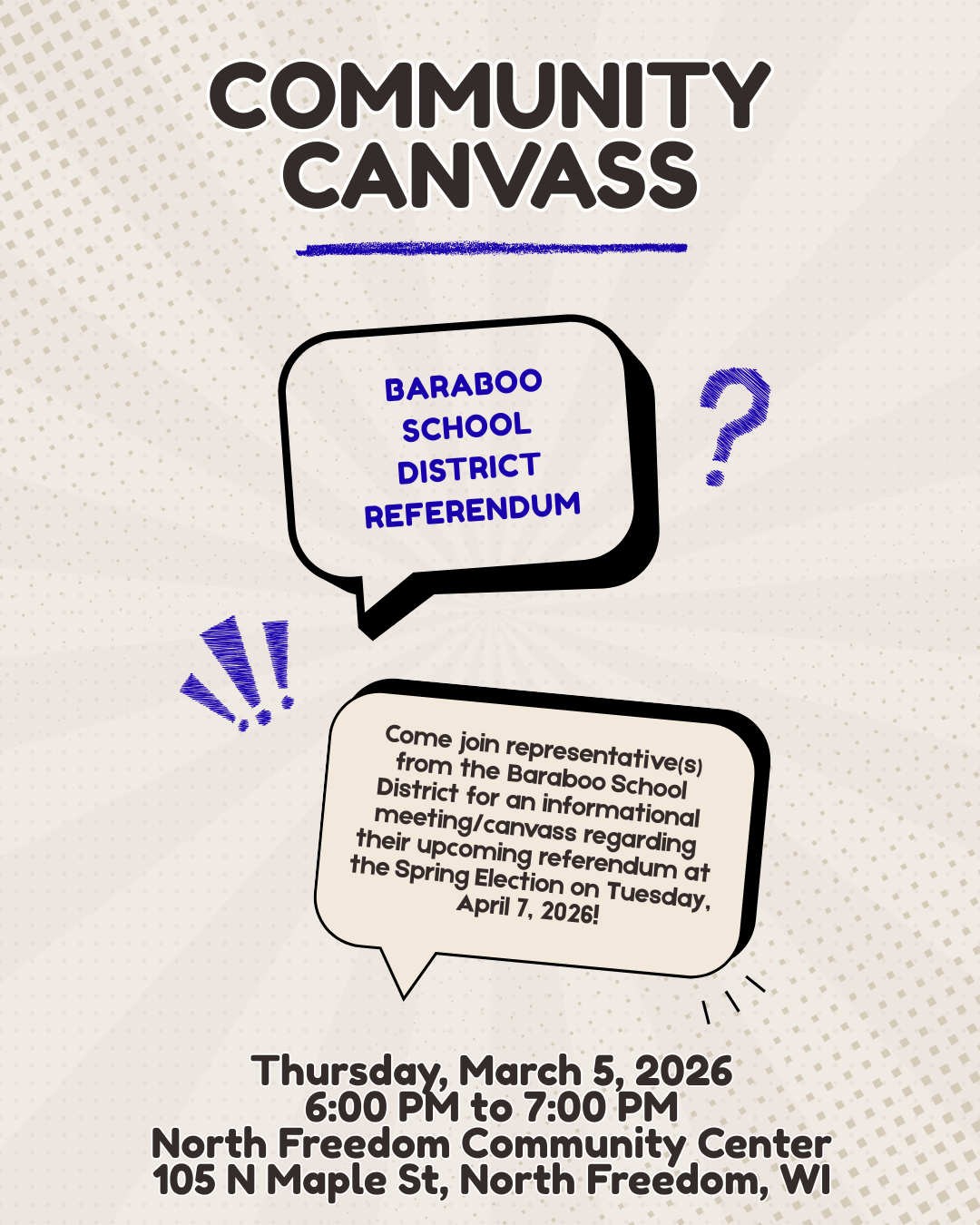 The Baraboo School District has scheduled a community canvass session at the North Freedom Community Center (105 N Maple St, North Freedom, WI) for an informational meeting and canvass regarding their upcoming referendum that will be at the Spring Election.
