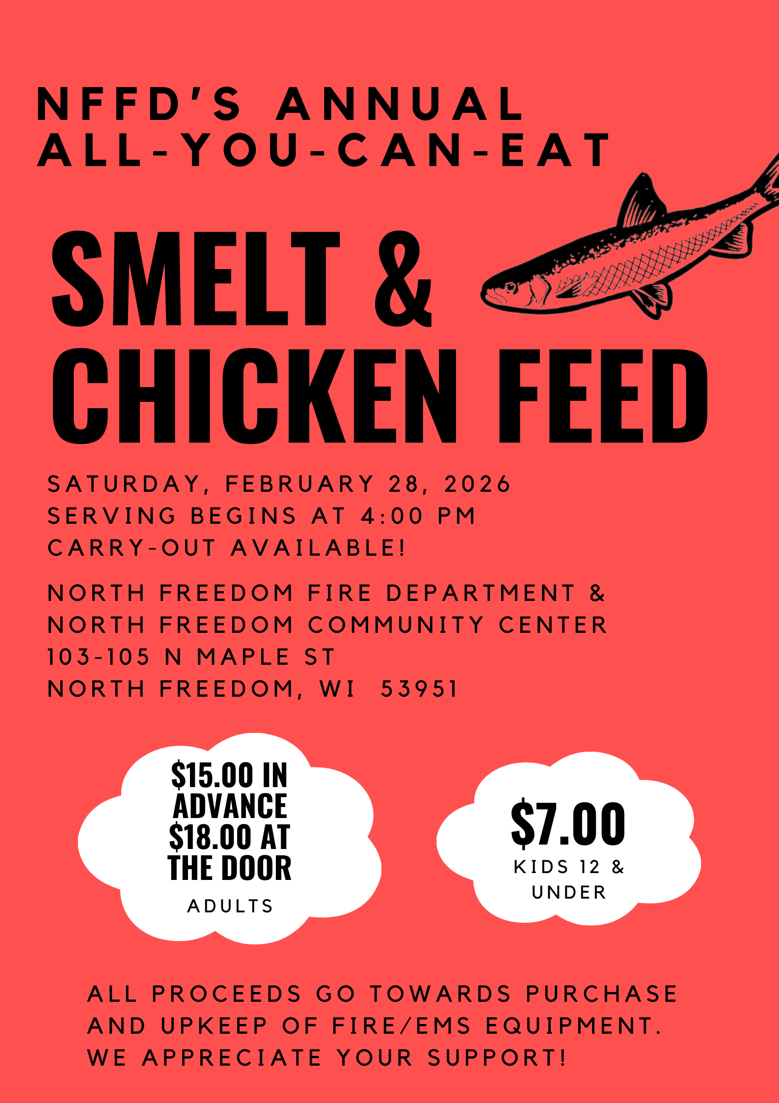 NFFD's Annual All-You-Can-Eat Smelt & Chicken Feed will be on Saturday, February 28, 2026! Tickets are out now! Prices go up at the door!