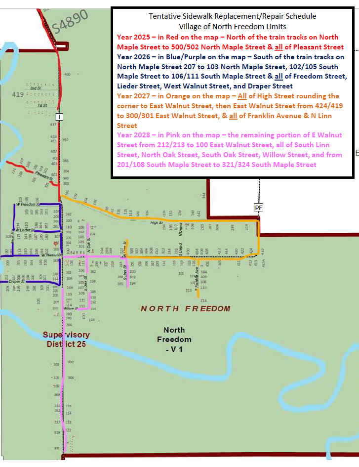 The Village of North Freedom Board is in year 2 of repairing and replacing ALL sidewalks in the Village. The Village is currently seeking quotes for the year 2026 work. 2026 includes the portion of the map in Purple/Blue.