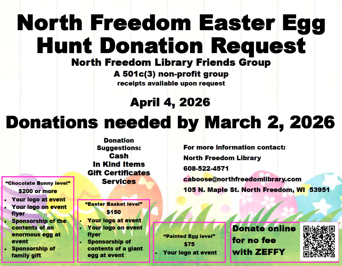 The North Freedom Library Friends Group is starting their planning for the North Freedom Egg Hunt happening on Saturday, April 4, 2026. They are currently looking for event sponsors.
